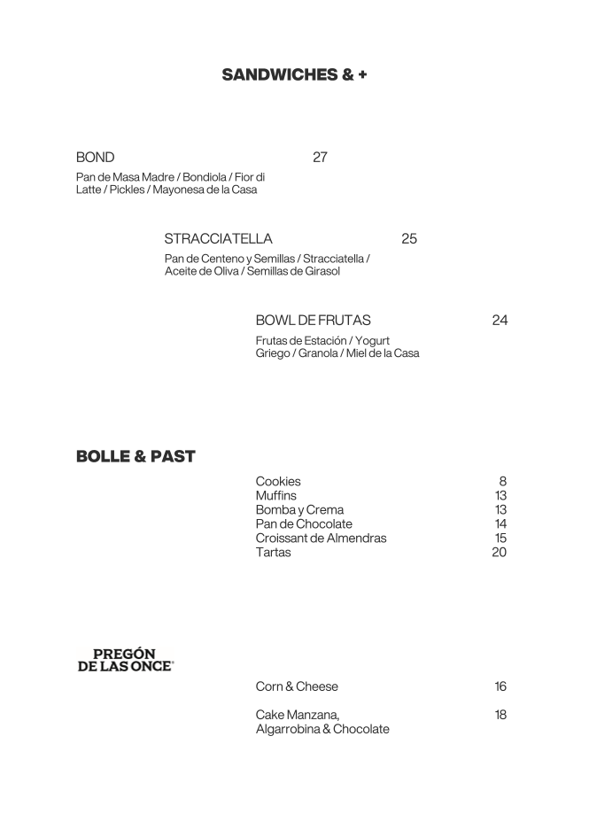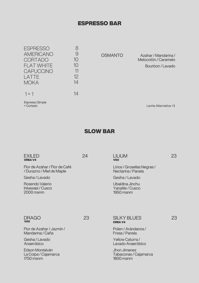 The menu offers a focused selection of specialty coffee beverages and light food options suitable for breakfast, coffee breaks, and casual dining. It features a range of espresso-based drinks including cappuccinos, cortados, and matcha lattes, crafted from Peruvian single-origin and seasonal coffee beans. Additionally, there are filter coffee options highlighting distinct coffee varieties.